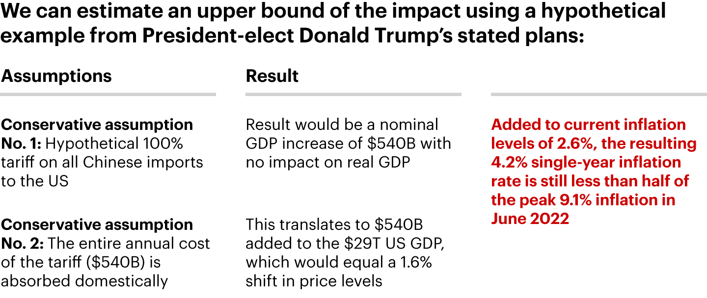 In the event of a broad increase in tariffs, it is virtually impossible to fully anticipate the net effect of the policy. We can, however, say it’s unlikely that the cost of the tariffs will be fully borne by either consumers or foreign entities. While the global economy is in a very different place than it was in 2017, back then tariffs had a negligible impact on US consumer price inflation; at the product level, though, the impact was varied, and it changed over time as well.