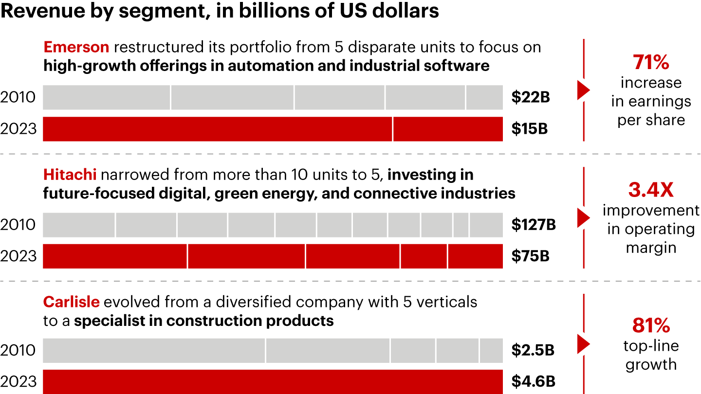 Emerson transformed itself from a collection of machinery companies to a strong competitor in high-growth sectors. Its portfolio included a number of relatively unrelated assets—each with a good competitive position but low growth, relatively underinvested in, and better ownership candidates. The company demonstrated the power of rigorous portfolio reassessment, focusing on core areas while divesting nonstrategic assets.