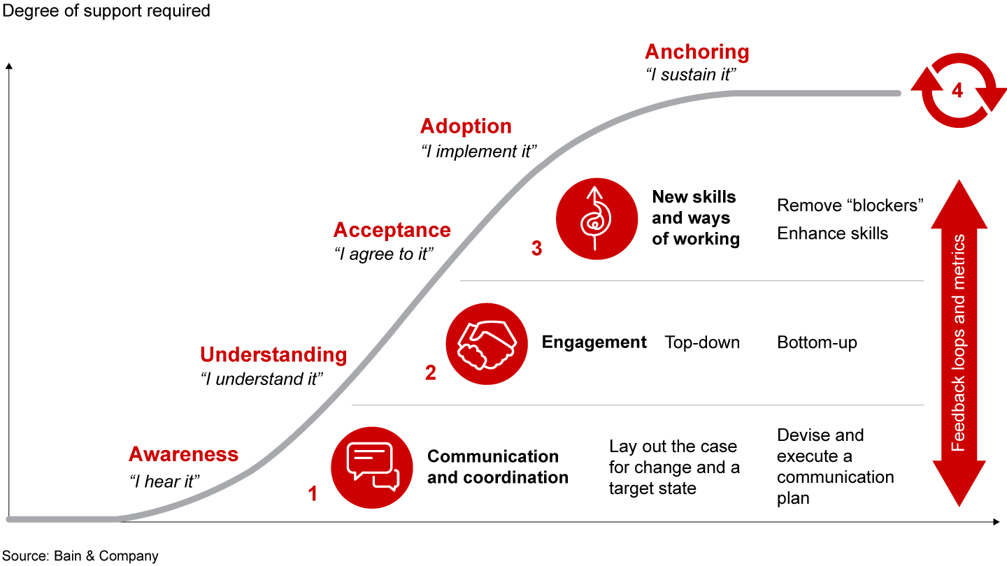If communication and engagement have been effective, most employees will have accepted the change. But acceptance does not equal implementation; that is where dedicated measures come in. Enhancing employees’ skills, tools and methods can do the job. For a digital transformation, this often includes new, more flexible ways of working, as well as hard skills such as data tagging and data analysis.