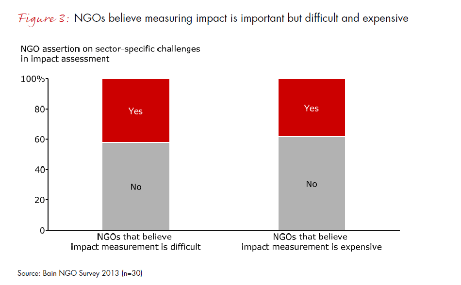 The NGOs surveyed by Bain testified to the measurement challenges associated with these dimensions. A full 40% find such efforts difficult, and a similar proportion cites the cost of evaluation as a deterrent (see Figure 3).
