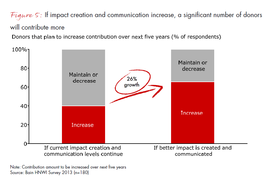 This is likely to create an uplift of about 20% in donations from impact-motivated HNWIs. Taking a more conservative view, that translates to an increase of 5% in the total private donation corpus.