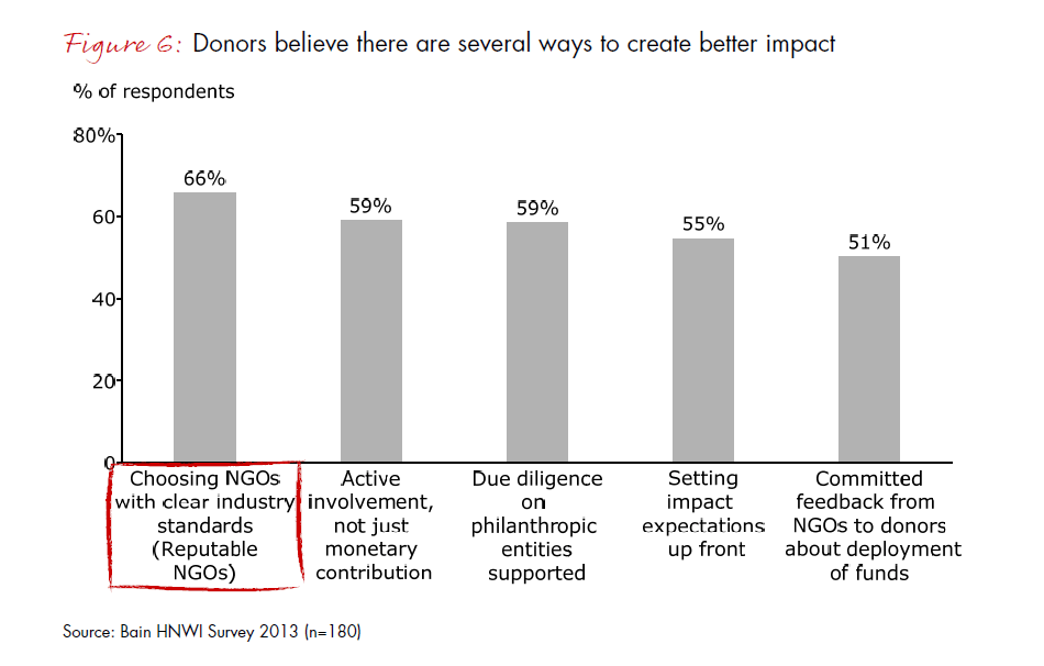 Apart from conducting a rigorous due diligence of the organisations they support, donors can get a bigger bang for their buck by setting expectations about impact at the start of the funding process. In addition, donors believe they can encourage better accountability by directing funds towards NGOs that adhere to industry standards (see Figure 6).