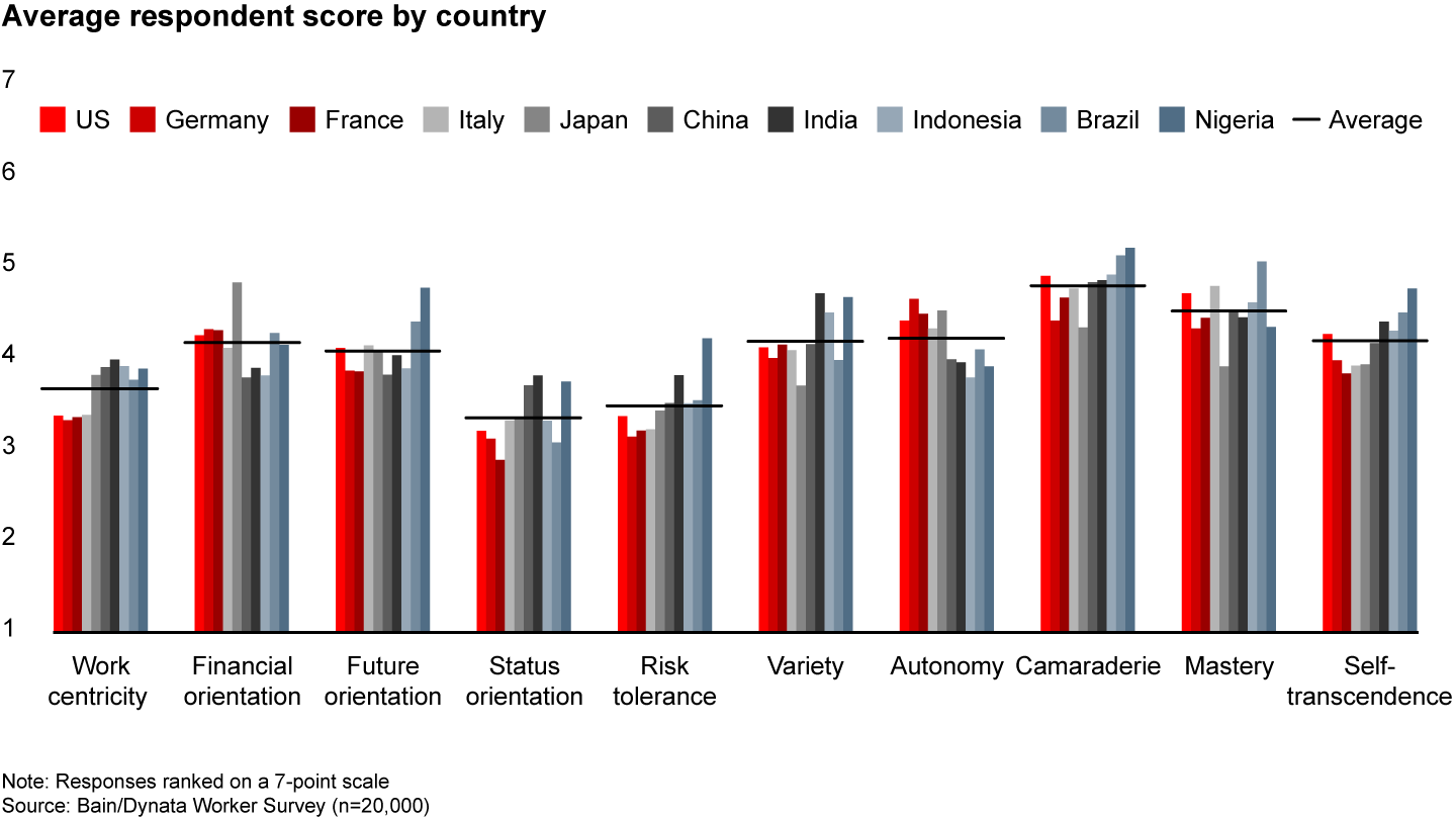 Far from a normal distribution, we found significant variation in scores on all 10 dimensions in all 10 countries covered in our research. In other words, thinking about what the average worker wants from a job no longer makes sense in the modern economy.