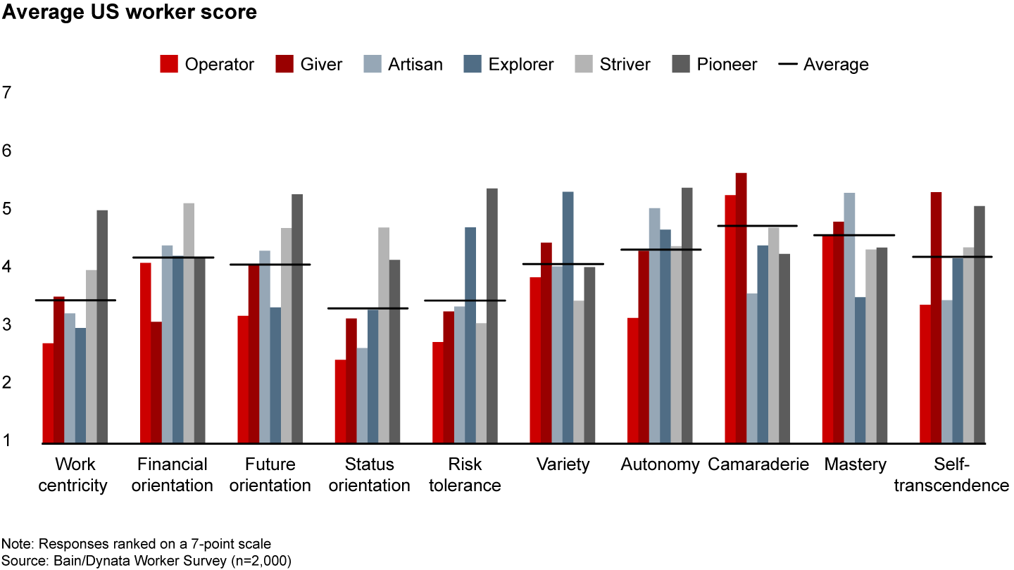 These archetypes help us better understand what it takes for different individuals to find a sense of purpose at work. For some archetypes, such as Pioneers and Givers, working in organizations with a clear social mission is often important. Strivers are more likely to find a sense of purpose in achievement, while Artisans may find it in mastery. For Explorers, it is likely to come from breadth of experience. Operators are more likely to find purpose outside of their work lives.