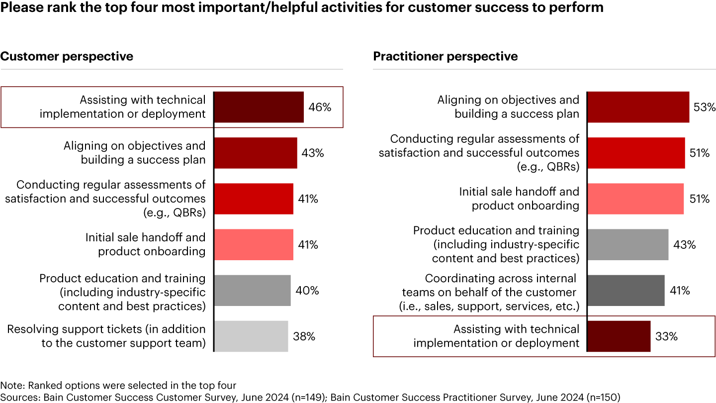 Why? Our research found a mismatch between how vendors provide support and what customers value. In our recent survey, software buyers ranked assistance with technical implementation or deployment as their highest priority for customer success, while practitioners ranked it sixth (see Figure 4). Vendors often provide general assistance but have abdicated too much technical implementation to systems integration partners. Clearly, customers see a role for vendors to provide architectural support and technical implementation best practices, even if systems integrators continue to do the heavy lifting.