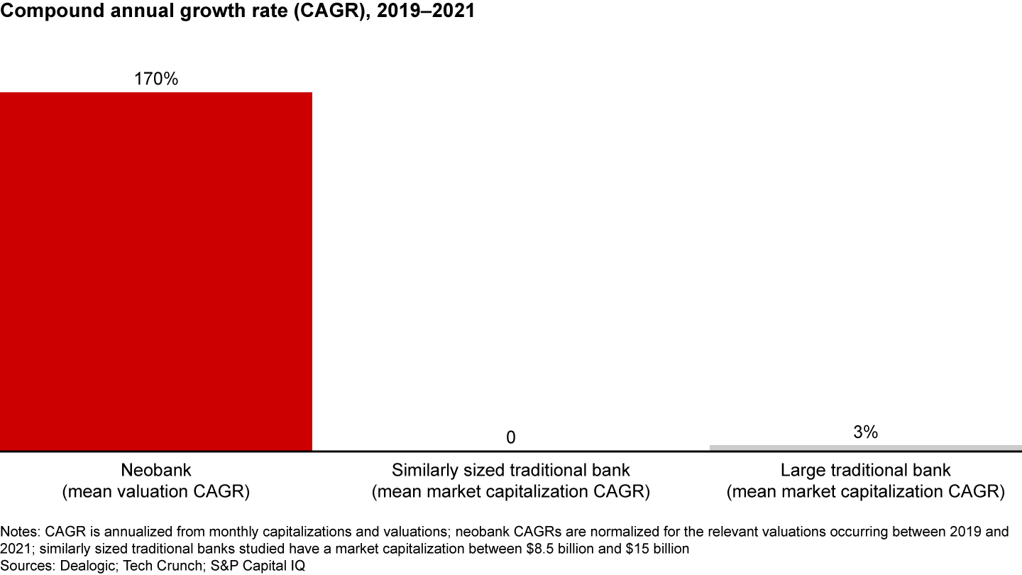 Neobank valuations grew rapidly between 2019 and 2021 while traditional bank market capitalizations saw limited growth