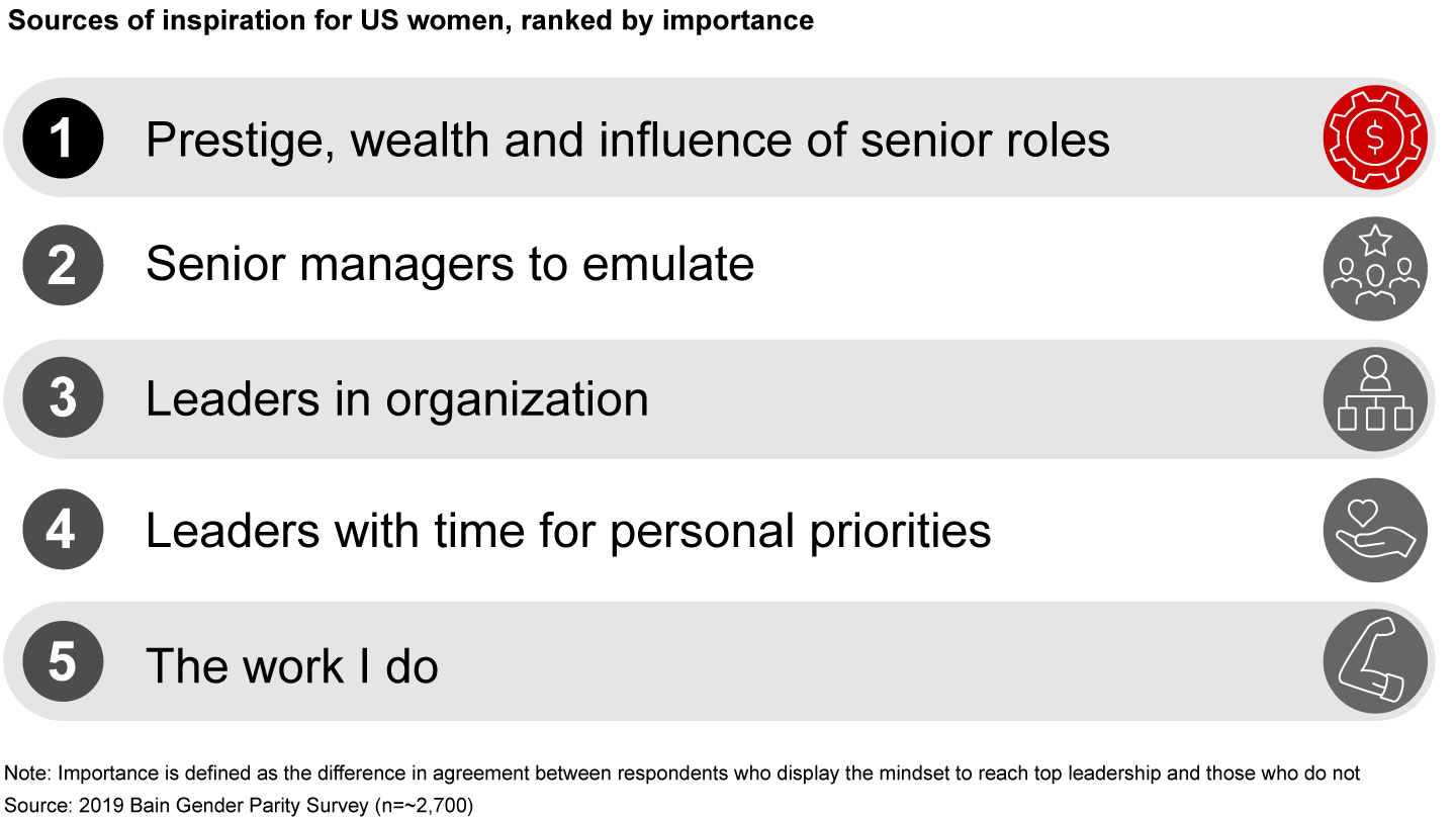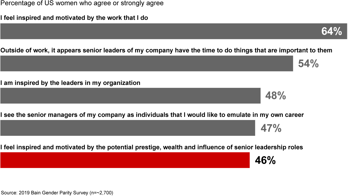 - Less than half of women surveyed in the US say they currently feel inspired and motivated by the potential prestige, wealth and influence of senior leadership positions, but our research shows that this factor is actually the most important to their reaching those roles.