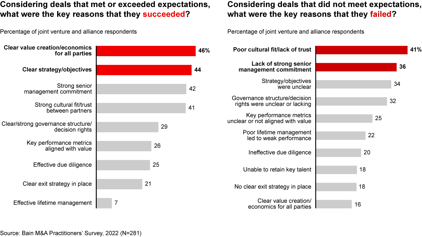 Clear value creation and strategy, strong senior management, and cultural fit are key factors for joint venture and alliance deal success