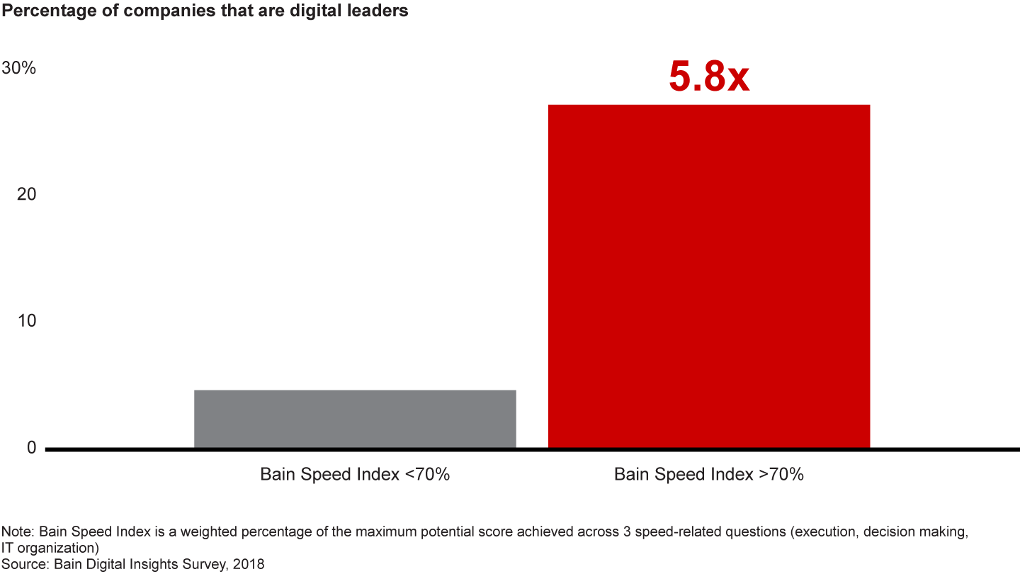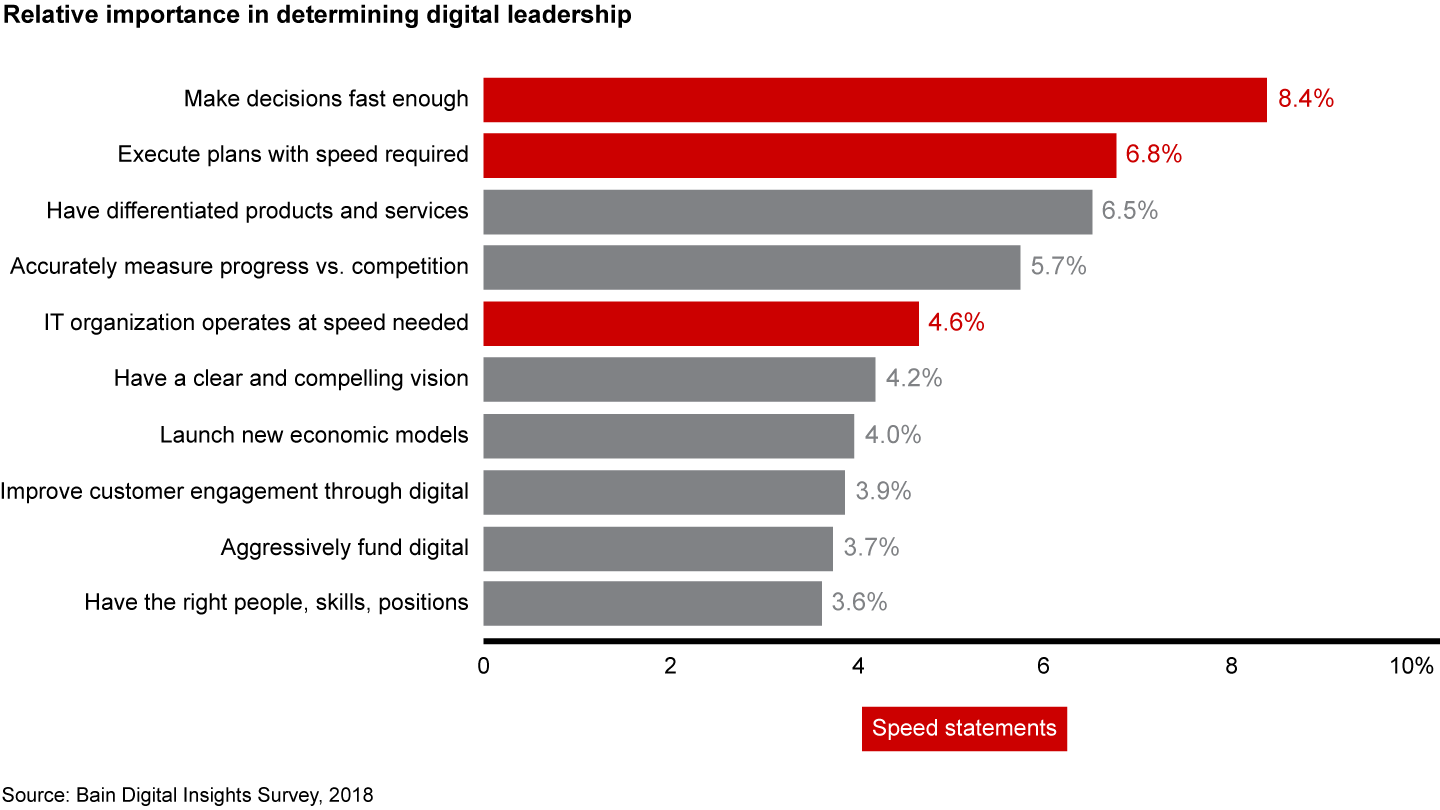 That speed matters is conventional business wisdom. It’s become such a common observation that managers could be forgiven for tuning it out. Our research confirms that speed is critical: Three of the top five differences between leaders and laggards relate to speed, and speed leaders are six times more likely to be digital leaders (see Figure 1). But perhaps more useful is how the data helps us define speed in a more granular way, one that provides insight executives can act on.