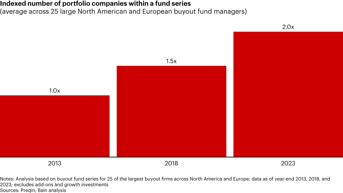 Among them is a sharp rise in the number of active portfolio companies over the past several years—a result of dealmaking outpacing exits and funds holding assets for longer. An analysis of fund series at 25 of the largest buyout firms shows that the number of portfolio companies they manage has doubled over the last decade, leaving sponsors with twice as many claims on their limited resources and bandwidth (see Figure 5).