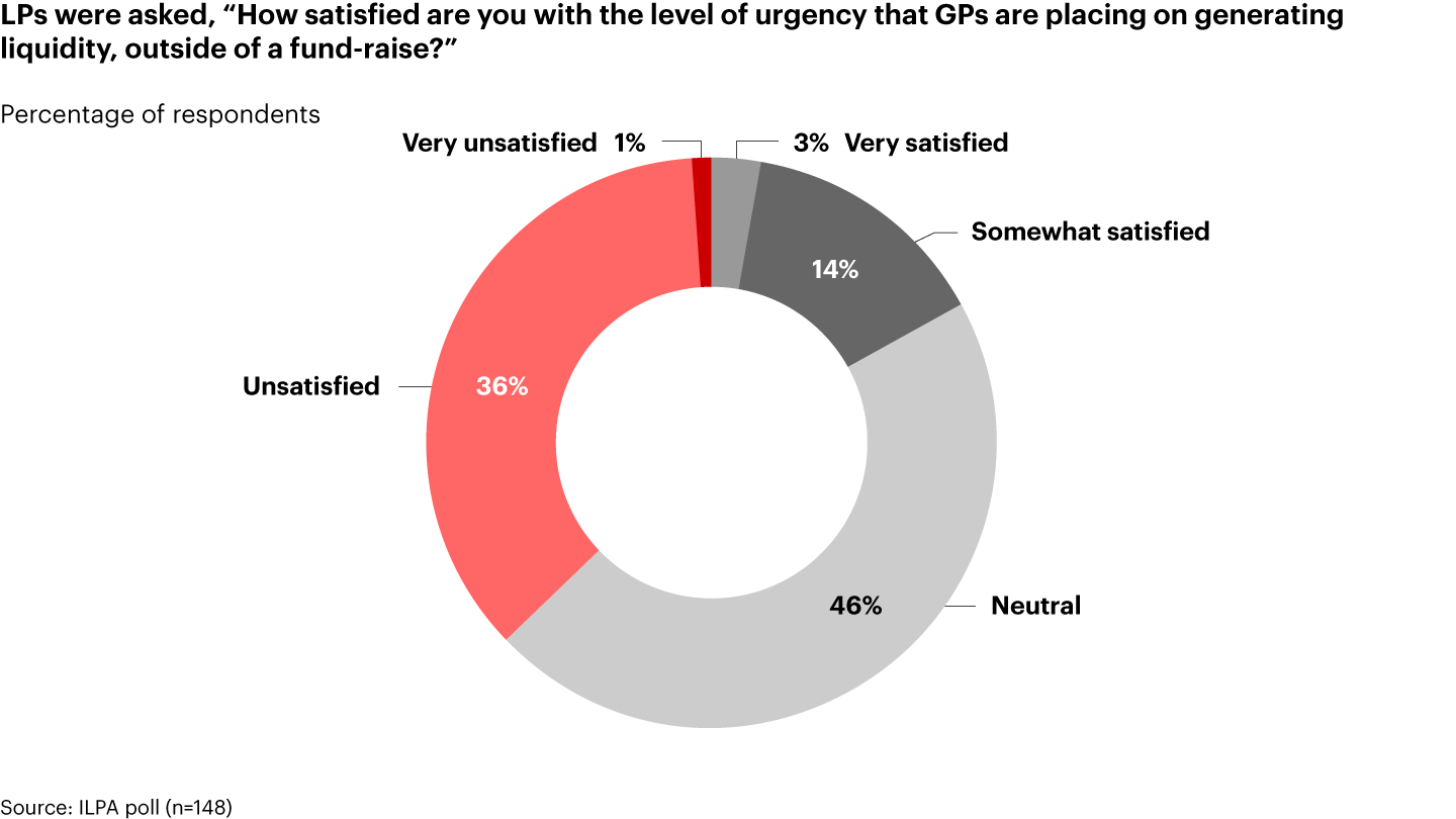 None of this, however, suggests that the industry’s current level of inactivity is sustainable over the long term or that LPs aren’t losing patience with the pace of distributions. Indeed, only a small minority of the respondents in a recent poll by the Institutional Limited Partners Association said they were satisfied with the urgency GPs are placing on increasing liquidity (see Figure 7).
