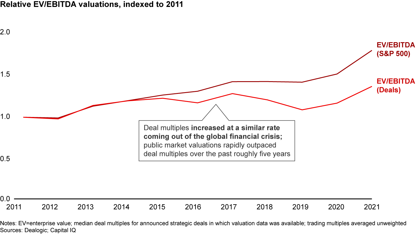 Strategic buyers faced increased competition when they got into the game. Given their ability to underwrite synergies, strategics have historically had a strong hand against financial buyers. In 2021, nonstrategic buyers continued to grow their share of deal value as financial investors sought to deploy accumulated dry powder. Moreover, as public market valuations outpaced deal multiples, financial investors increasingly chose equity market alternatives such as initial public offerings and SPACs over exits to strategics. These trends challenge strategic buyers to identify, size, and underwrite synergies, including revenue synergies, to ensure competitiveness against alternative sources of capital.