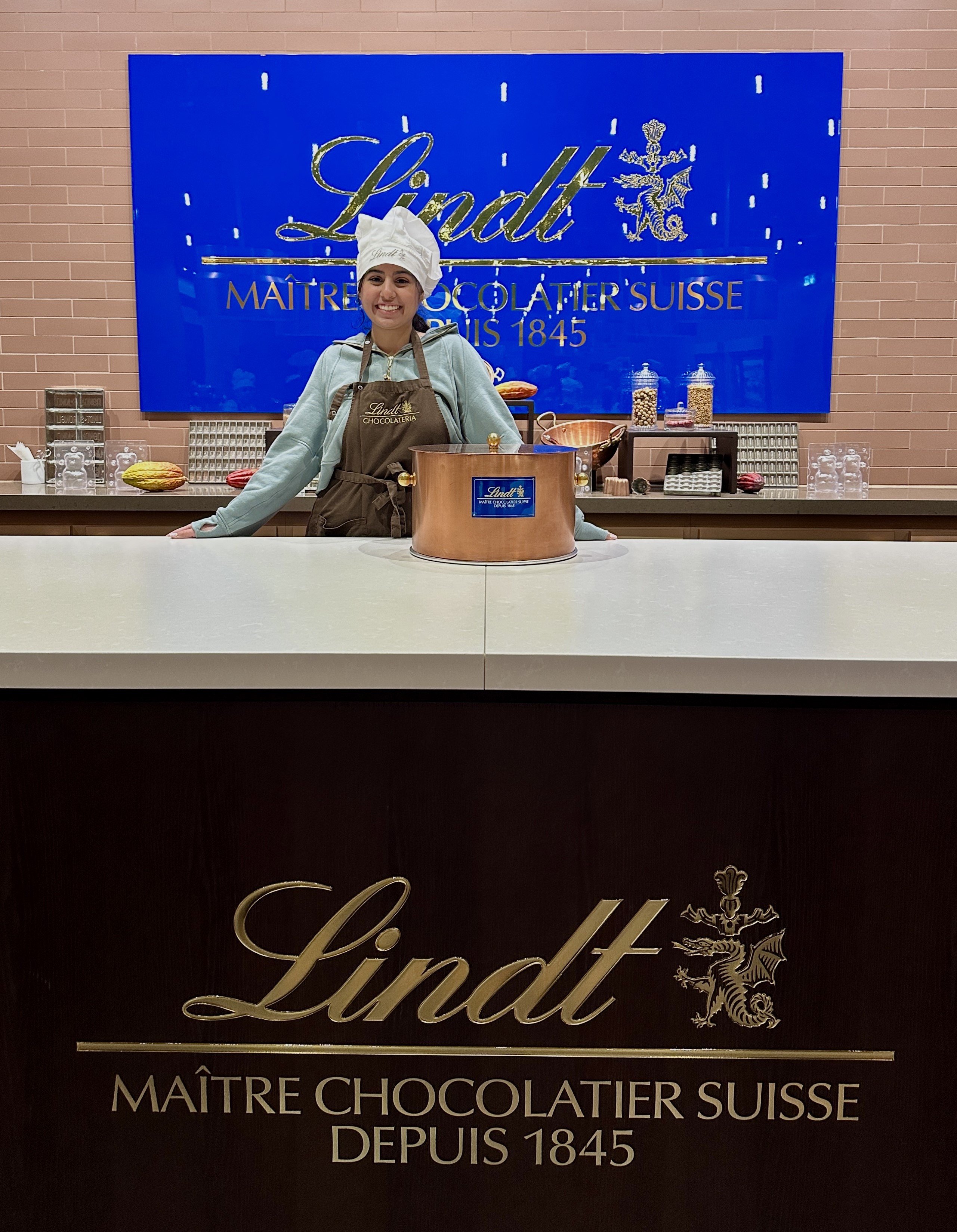 A "sweet" perk of her office transfer, participating in a chocolate-making class at the Lindt factory in Switzerland.