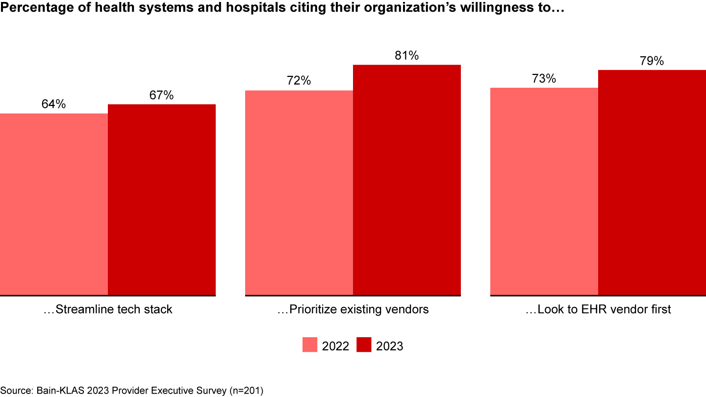 As providers continue to face an array of structural challenges—including secular provider shortages, an aging population, and financial pressures—they will increasingly prioritize IT solutions that produce a tangible ROI and will more frequently look to simplify their tech stacks. Vendors will need to offer best-of-breed solutions or compelling suites in order to differentiate themselves.