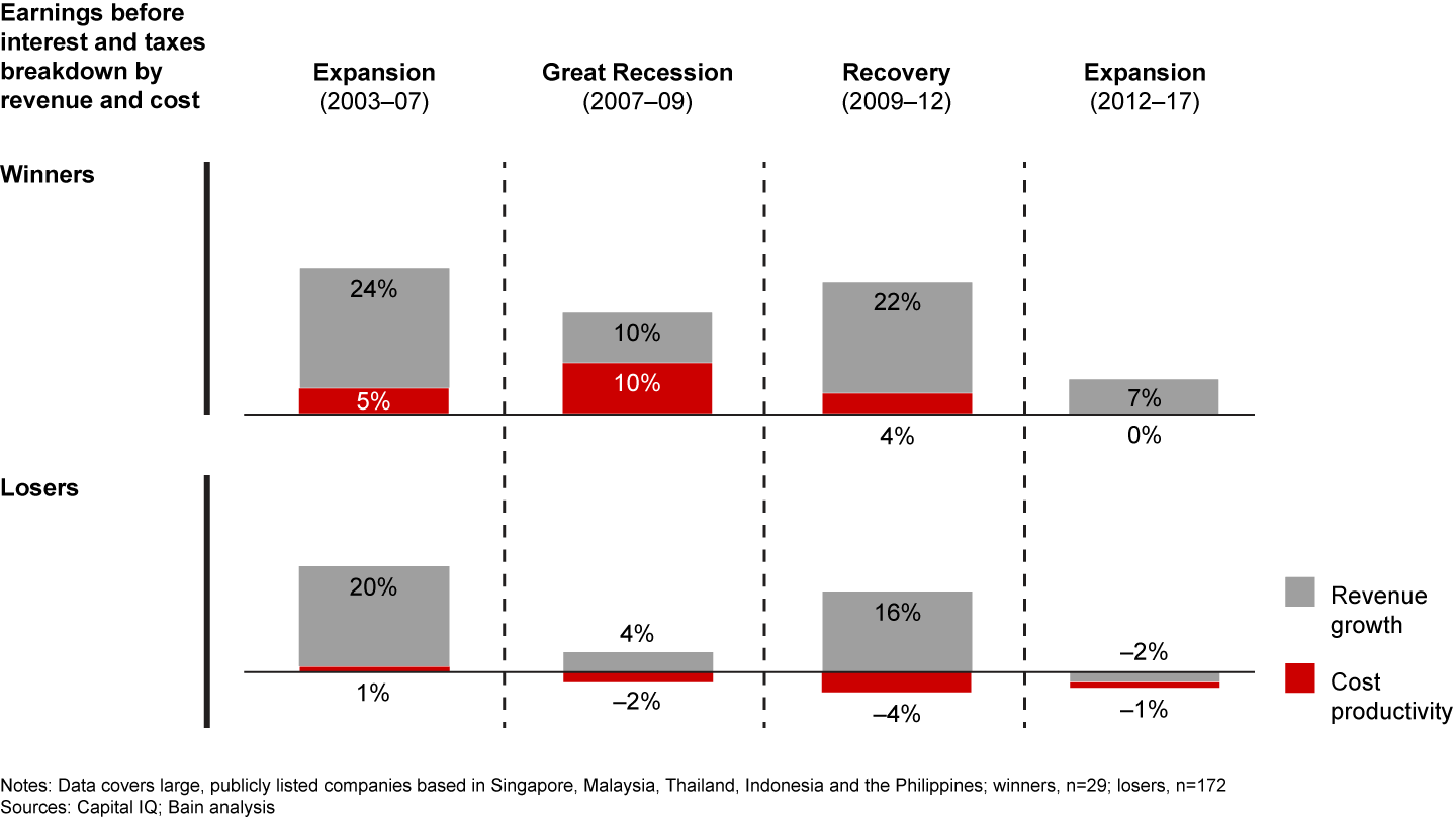 Bain & Company research finds that well-prepared Southeast Asian companies emerged as winners during and after past downturns. They managed strong defense and offense in parallel, focusing on raising their cost productivity to become more efficient even as they invested in growth.