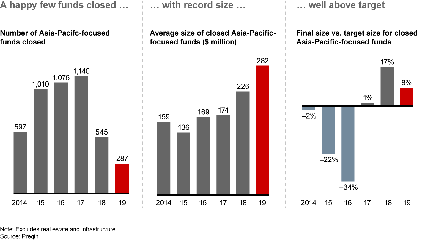 Fund-raising data underscored the ongoing flight to quality, with the average size of Asia-Pacific funds expanding to a record $282 million from $226 million in 2018. Total capital raised was spread among far fewer funds, which closed 8% ahead of their target (see Figure 2.12).