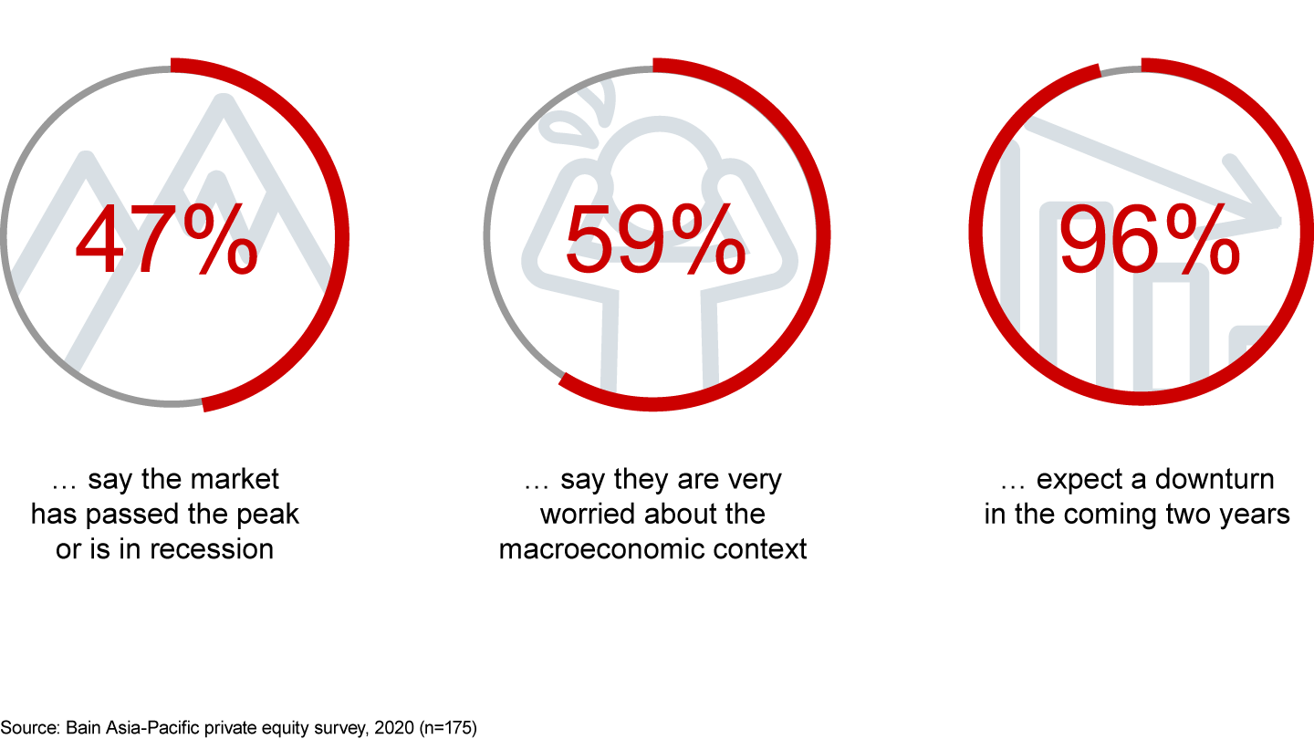 Those somber forecasts have investors on edge. Fifty-nine percent of Asia-Pacific GPs ranked macroeconomic conditions­—mainly associated with the financial crisis and trade war—among the top three issues keeping them awake at night. Almost half said they believe private equity has now passed its peak or entered a recession phase, and a striking 96% expect a downturn in the next two years, with 54% anticipating a severe or moderate impact on their portfolio (see Figure 3.1).