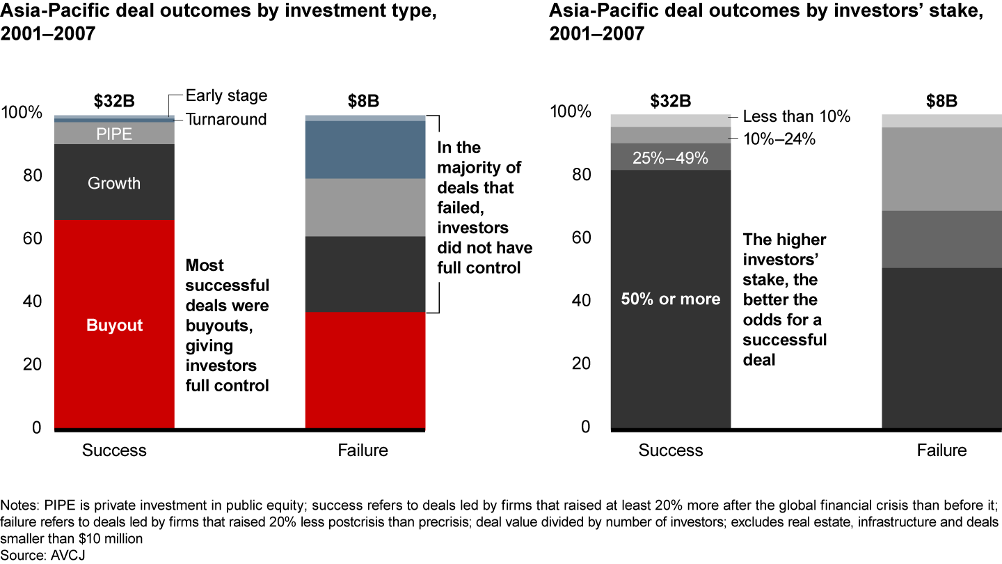 What sets the winners apart from the rest? To answer that question, we analyzed around 2,500 Asia-Pacific deals and 1,280 exits from 2001 to 2007 that were greater than $10 million, excluding real estate and infrastructure. Our analysis of fund performance revealed several vital insights about how investors can survive and thrive in a downturn. Specifically, successful funds understand four important truths about the market: