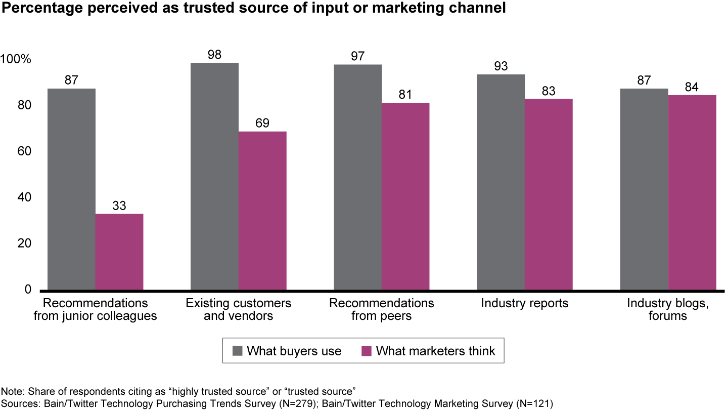 Understanding buyers’ preferences obviously matters for vendors’ success. A new survey conducted by Bain & Company and Twitter, part of our ongoing research on how the Covid-19 pandemic is changing B2B marketing dynamics, reveals a fundamental disconnect, however, between the 279 US buyers and 121 marketers covered. Buyers overwhelmingly trust information from their professional community—mainly their peers, current customers or vendors, more junior colleagues and industry sources. Marketers, by contrast, consistently underestimate the importance of conversations in this professional community, and they overestimate their own ability to direct purchasing decisions.