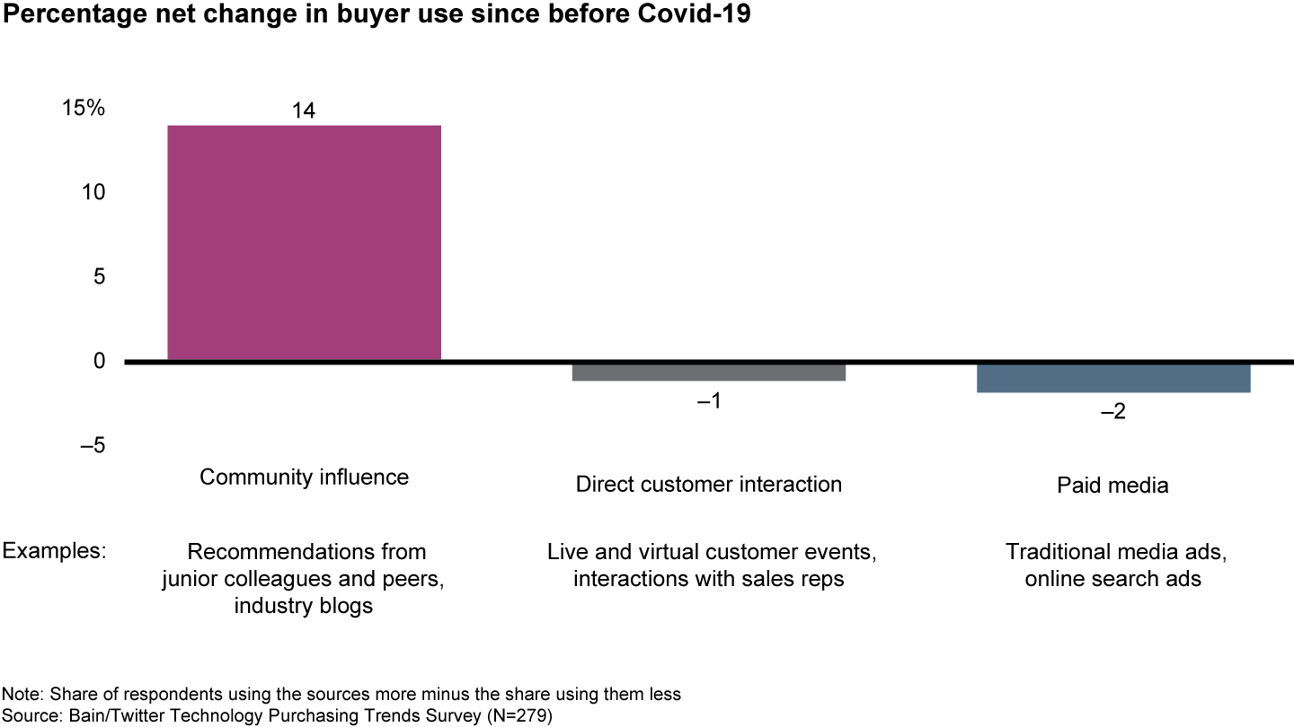 These preferences have become even more pronounced during Covid-19. More than 60% of buyers surveyed are still making technology purchases, and 90% have been educating themselves for future purchases. Moreover, they have relied more on information from their community since the pandemic began (see Figure 4).