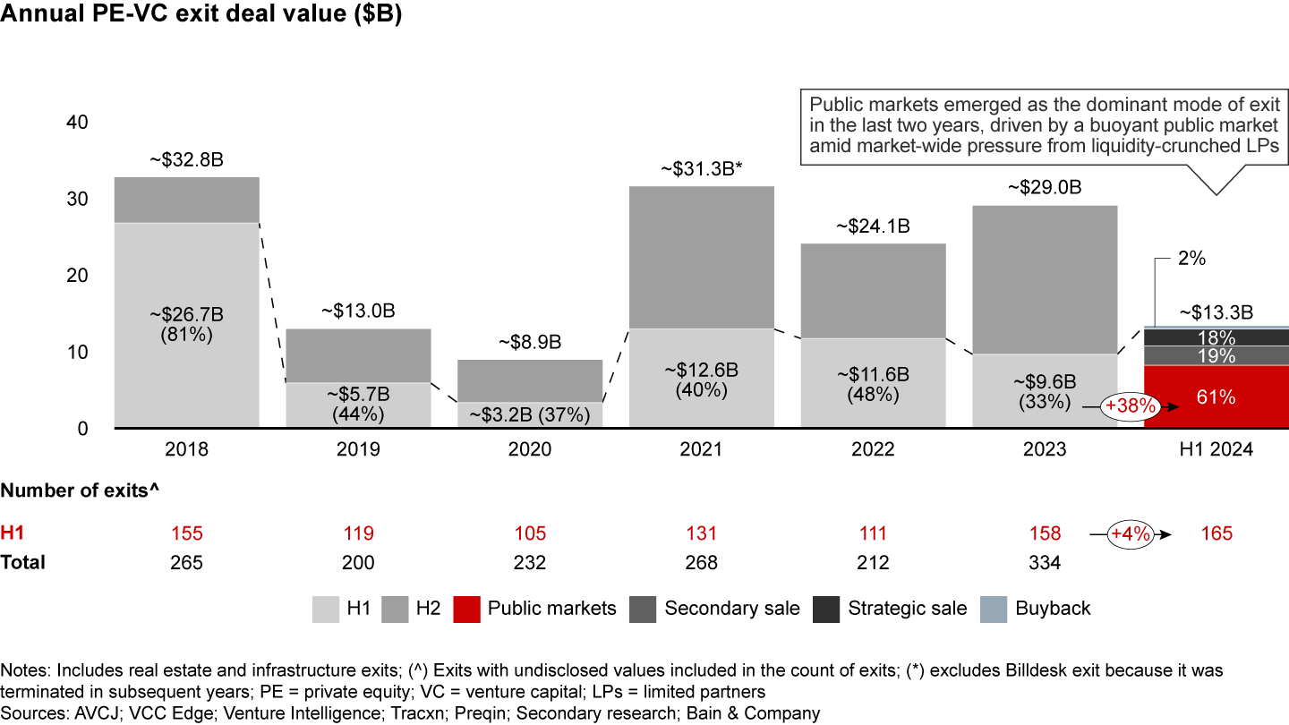 Despite the absence of mega exits ($1 billion+ exit value), exit activity in H1 2024 reached a six-year high (see Figure 2). Exit deal values grew by ~40% YOY, from ~$9.5 billion in H1 2023 to ~$13.3 billion in H1 2024, thus reversing the exit activity tapering that began in H1 2021.