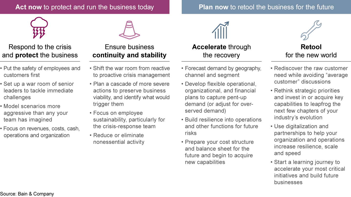 CEOs working urgently to balance dozens of critical priorities each day are starting to focus on two leading questions: “How can we ride out the crisis to emerge stronger than others in our industry?” and “How can the organization learn through this experience to win in a new world?” To guide the decisions and actions that will answer those questions—through the welter of competing demands, the sometimes chaotic conditions and the paramount importance of doing the right thing—some leadership teams have committed themselves to two guiding principles: act now to protect and run the business today, and plan now to retool the business for the future (Figure 1).