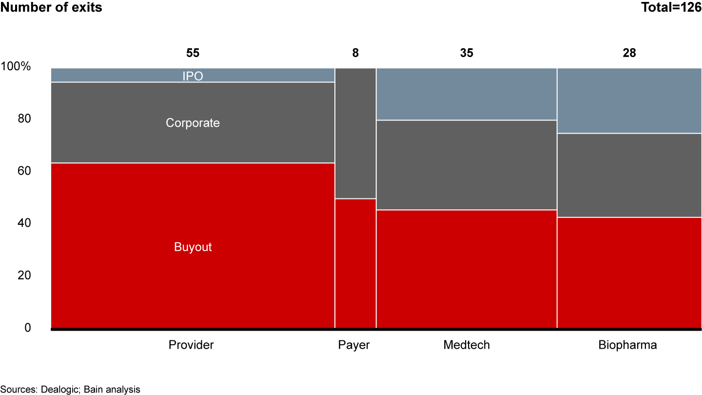 Biopharma and medtech exits continue to differ from those in the provider and payer sectors. In biopharma and medtech, sales to corporates, or IPOs, are more prevalent. By contrast, provider and payer sectors both feature a high concentration of sponsor-to-sponsor deals, with some corporate activity (see Figure 13).