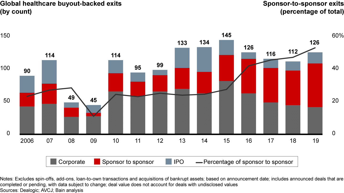 While these conditions make it difficult for sponsors to compete for deals, they also give sponsors an exit route of selling their assets to corporates. In the largest healthcare exit of 2019, Apax Partners, CPPIB and PSP Investments sold Acelity, a medical equipment and supplies manufacturer, to 3M for $6.7 billion. Another exit saw H.I.G. Capital, Morgenthaler, and Thomas, McNerney & Partners sell Vertiflex, the developer of a minimally invasive device used to treat lumbar spinal stenosis, to Boston Scientific for $465 million.