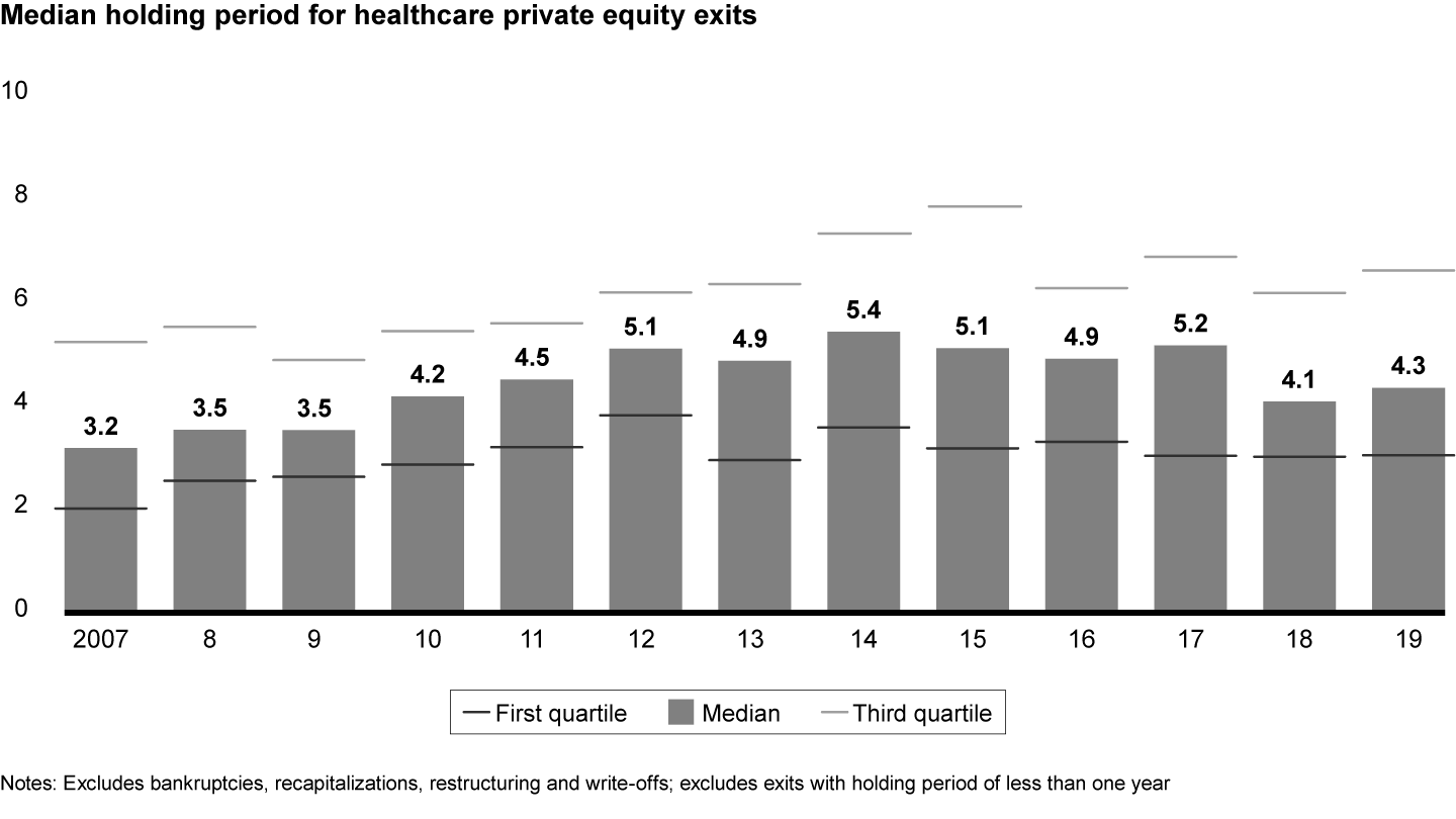 We would also note the increasing popularity of quick flips, or assets held for less than three years. The first quartile of holding periods has declined from 3.6 years in 2014 to 3.0 years in 2019. As private capital deployed to healthcare piles up faster than the number of assets, sponsors have more chances to resell high-quality assets. An example was EQT’s exit after only two years from Clinical Innovations, a medical device company focused on labor and delivery and neonatal intensive care, to Patricia Industries-owned Laborie Medical Technologies, for $525 million.