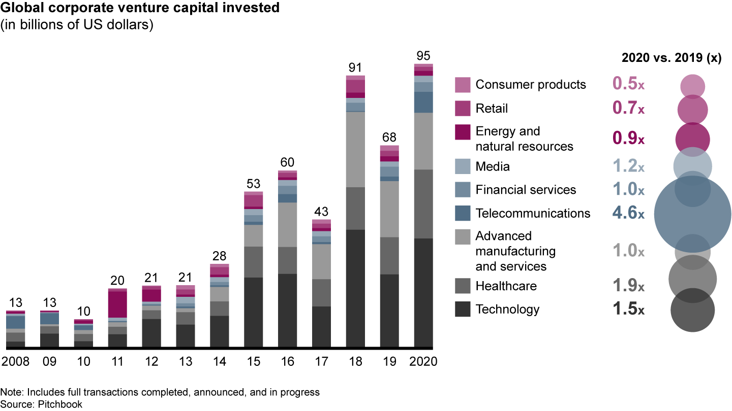 When we first wrote about corporate venture capital in 2018, it was still quite nascent, albeit with almost fourfold growth over the previous five years. Since then, corporate venture capital has expanded significantly, and it has proven its resilience in the tumultuous year of 2020, with $95 billion invested. That sum represents the highest annual deal value invested by corporate venture capital firms ever.