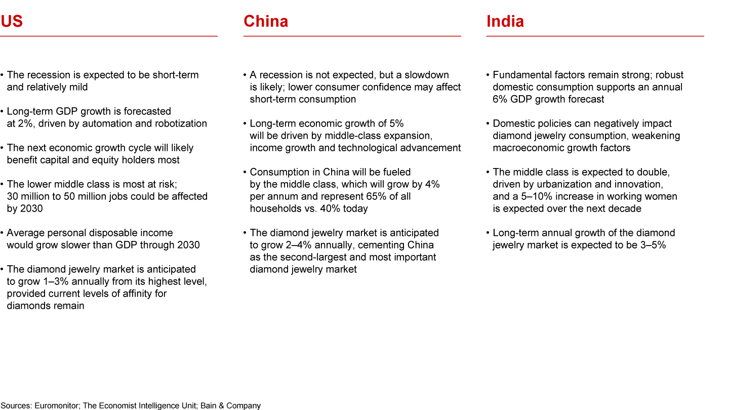 • This forecast does not consider several factors that could disrupt the supply–demand balance in the short term and slow the overall global trajectory. Consumer confidence and demand for diamond jewelry could be negatively affected if the US recession is longer than expected or if the slowdown and uncertainty in China caused by trade tension continue. Ongoing currency fluctuations and short-term policy changes in India could disrupt that country’s potential, as they have in the past. The biggest potential disruption is consumer preference. Continued and concerted marketing efforts are imperative to sustain long-term demand.