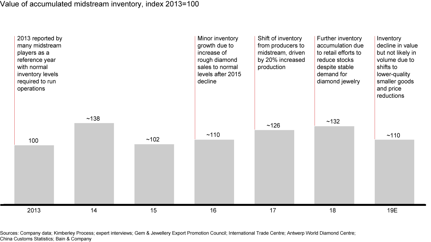 • The 26 million-carat production increase in 2017 was the largest single-year volume increase since 1986, and it created a surplus that affected the entire value chain. As a result, inventory in the mining and midstream markets increased through 2019. Prices and revenues declined in both segments in 2019 despite only a slight decrease in consumer demand. Assortment sales shifted toward smaller stones in 2019, which also contributed to lower sales.