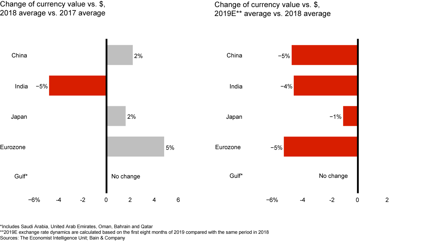 • In 2018, the Chinese market, including Hong Kong, grew 4%. In 2019, that trend reversed; the Chinese market is expected to decrease by 5% in US dollars equivalent and 1% in local currency. The shift is attributed to yuan depreciation, declining consumer confidence stemming from trade tension between the US and China, and significantly lower sales in Hong Kong amid protests in the area. The decrease will be partially offset by growth in local consumption in Mainland China. A repatriation trend is being driven by import duty reductions, stricter gray market control and price harmonization among international retailers.