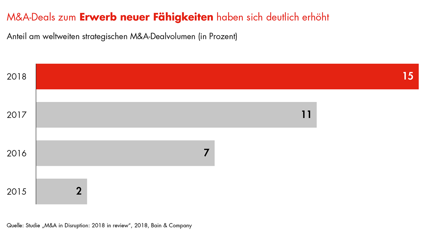 Der M&A-Markt ist im Umbruch. Firmenkäufe werden inzwischen vorrangig genutzt, um Wachstum zu beschleunigen und zusätzliches Know-how ins Unternehmen zu holen. Mittlerweile dienen rund 15 Prozent der größeren strategischen Übernahmen dem Erwerb neuer Fähigkeiten, im Jahr 2015 waren es lediglich 2 Prozent. Die Dynamik bei kleineren Deals dürfte noch größer sein. Dafür spricht die Vervierfachung der Corporate-Venture-Capital-Investitionen seit 2013. Insgesamt steht bei jeder dritten Know-how-getriebenen Übernahme im Vordergrund, digitale Kompetenzen für das Unternehmen zu gewinnen. Dies reicht von autonomem Fahren und digitaler Fertigung über E-Commerce und digitalem Marketing bis hin zu Internet der Dinge und Cybersecurity.