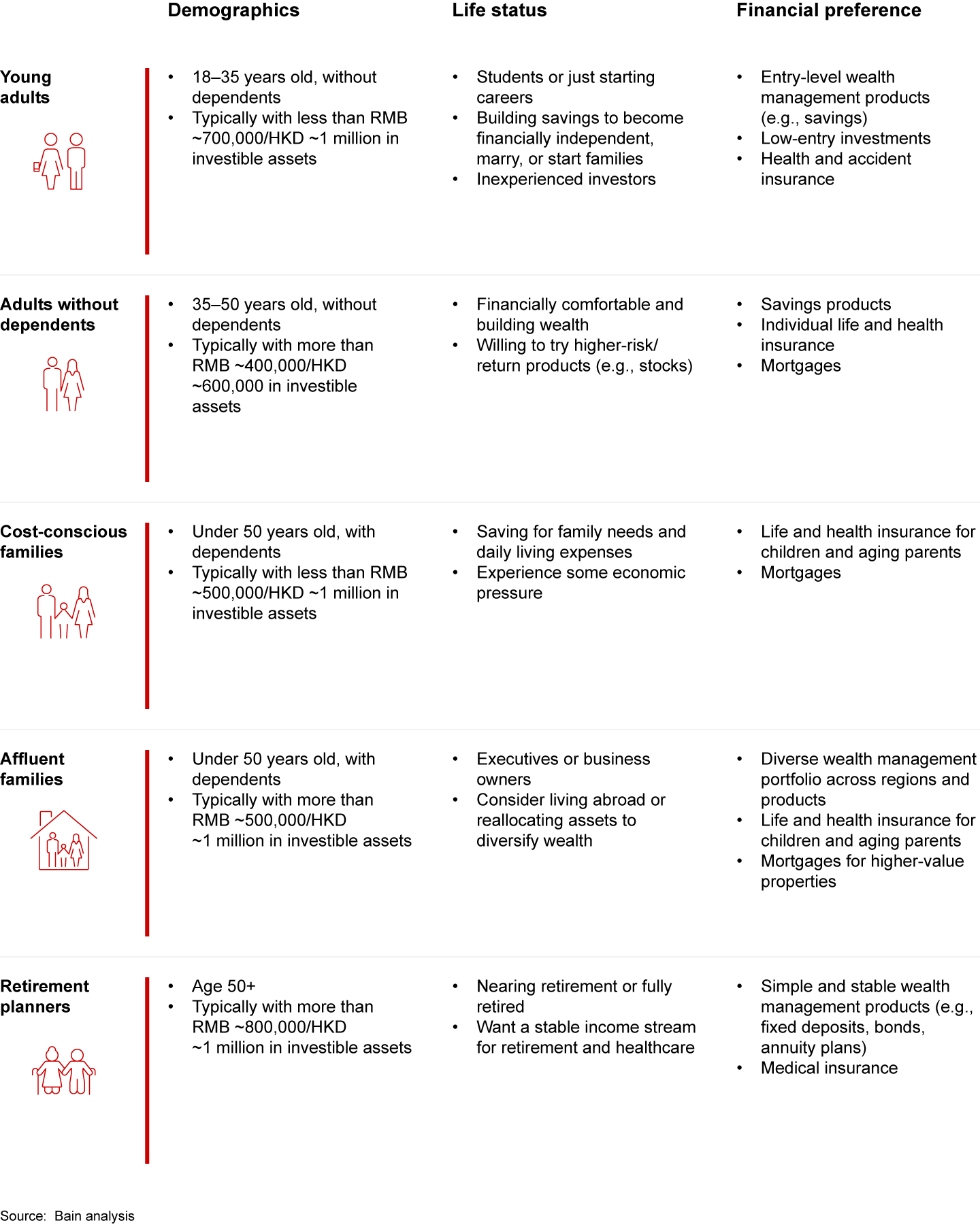 We analyzed the survey responses and organized GBA customers into five distinct segments based on age, wealth, and familial status (see Figure 6). These five segments are important for financial institutions to understand as they develop, sell, and service financial products in the GBA.