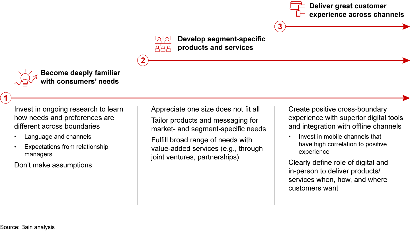 To compete for cross-boundary business, financial institutions need to understand how customers differ on both sides of the border and adjust their service models accordingly.