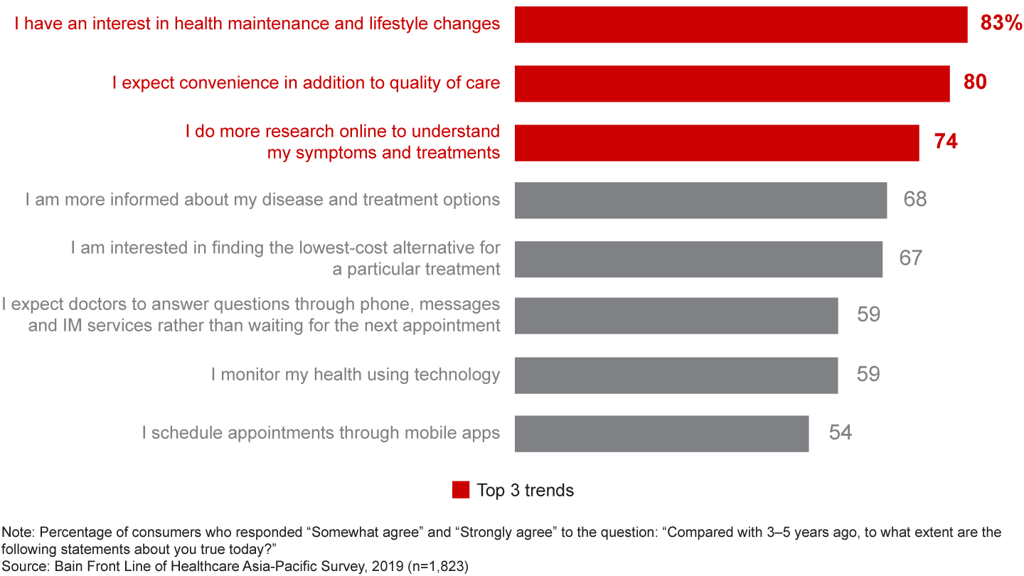 To better understand the region’s challenges and opportunities, Bain & Company surveyed more than 1,800 consumers in Australia, China, India, Indonesia, Singapore and Thailand, and more than 250 physicians in Australia, China, India and Indonesia. The results shine a spotlight on a region primed to reshape its healthcare landscape.