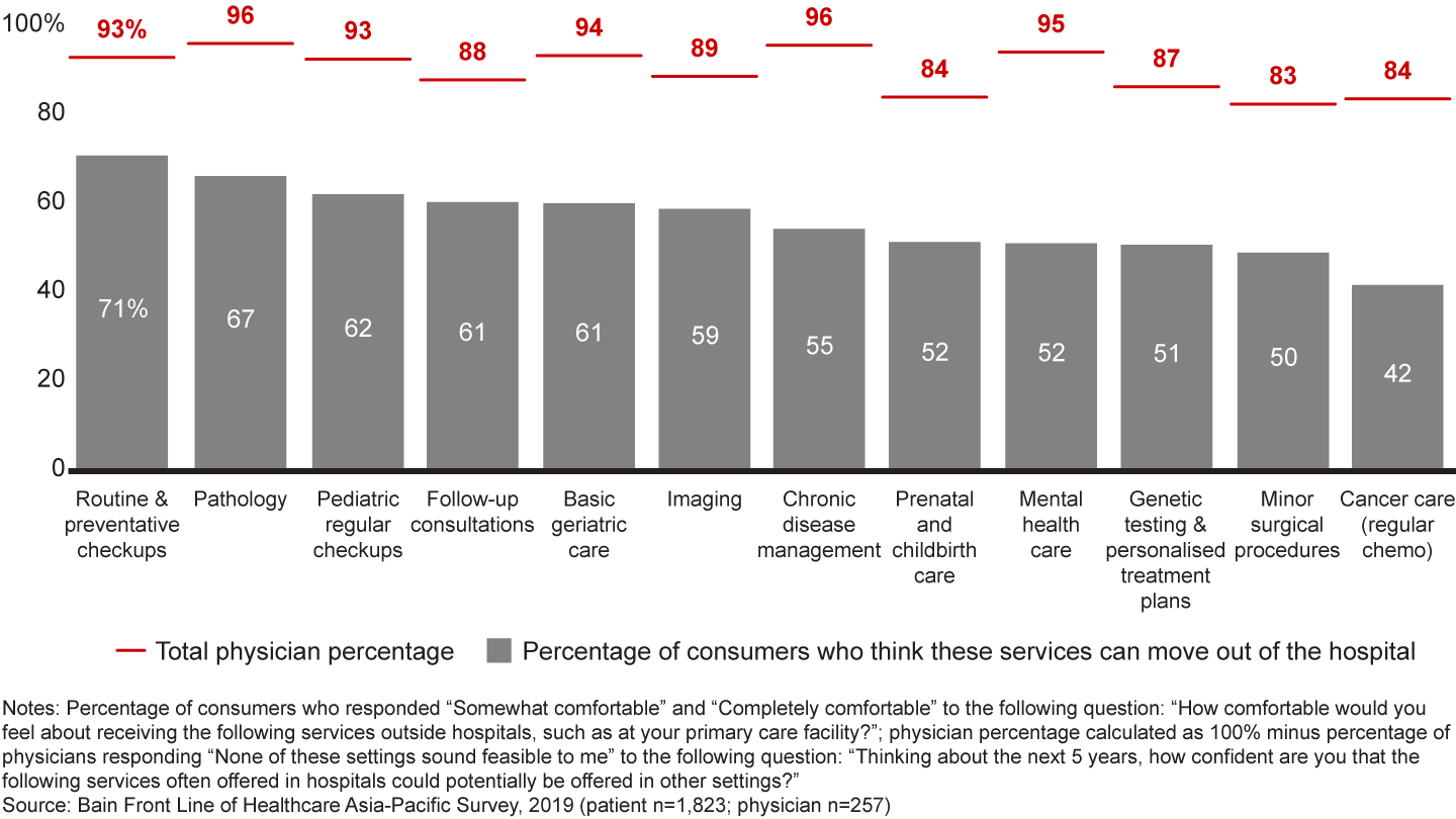 Opportunity No. 2: Transition care outside of hospital walls. Shifting nonemergency services from hospitals to outpatient settings or alternative delivery models will be key to relieving the burden on overextended hospitals. Roughly half of consumers surveyed would be comfortable receiving services in an outpatient setting, and more than 80% of physicians believe a number of nonemergency services could be offered outside of hospitals (see Figure 6). Moreover, physicians are open to shifting some services to digital or virtual platforms, or to relying on assistance from nonphysicians through the use of artificial intelligence (AI) or machine learning (see Figure 7).