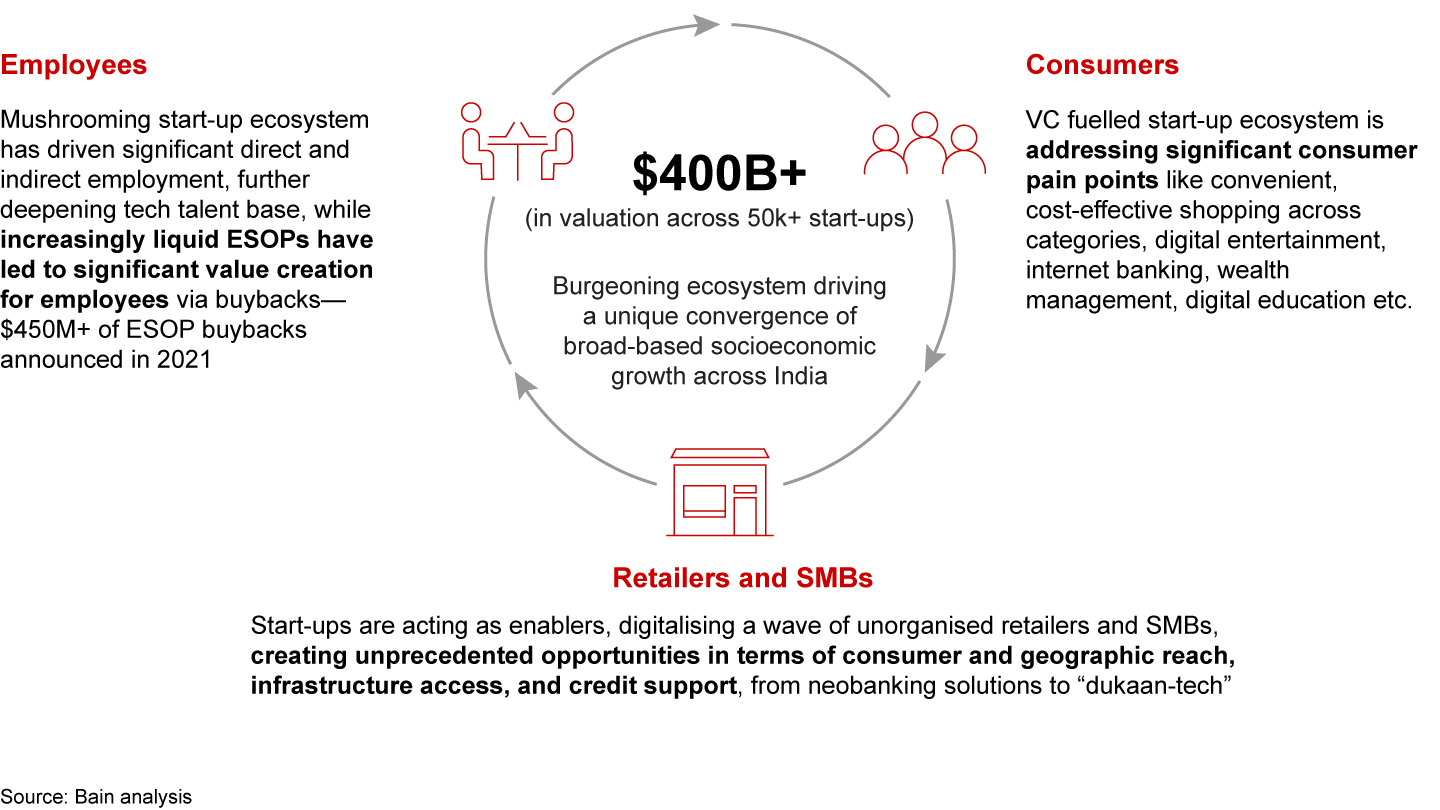 The Indian start-up ecosystem reached an inflection point in maturity in 2021, fuelled by VC investments. With $400B+ in valuation across a burgeoning ecosystem of 50K+ active start-ups, companies are looking to unlock significant economic value, addressing major pain points for consumers and small and medium businesses (SMBs). 2021 also saw significant wealth creation through employee stock ownership plan (ESOP) liquidation—30+ start-ups announced ESOP buybacks.