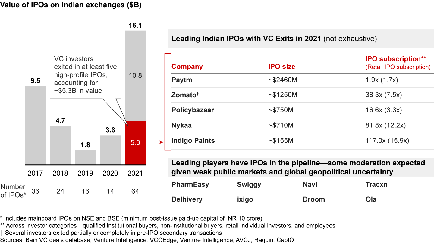 - Five high-profile IPOs in 2021, accounting for $5.3B (of total IPOs value of $16.1B), had VC exits. IPO momentum was largely driven by shifting regulatory climate on tech IPOs in India and public markets being at an all-time high, whetting retail investor appetite for tech listings in India