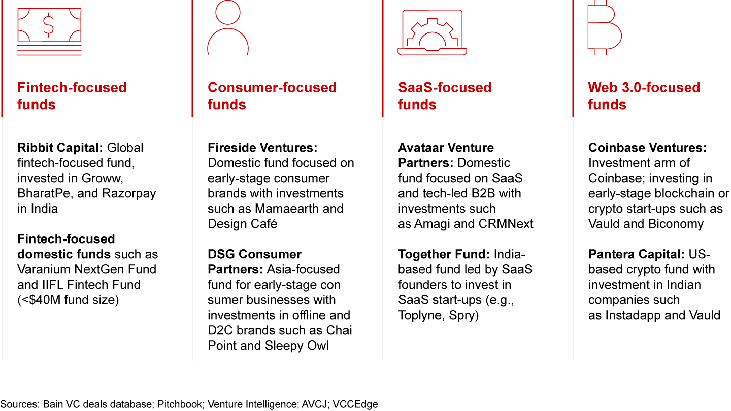 New investors made significant inroads into India in 2021: (a) several Tier 1 global VCs and crossover funds (e.g., Technology Crossover Ventures [TCV] and Dragoneer Investment Group) made large investments, (b) emerging domestic VCs gained presence (e.g., 3one4 Capital), and (c) global sovereign funds (e.g., Abu Dhabi Developmental Holding Company [ADQ], Qatar Investment Authority [QIA]) made direct investments. Sector-focused global and domestic funds doubled down (e.g., Ribbit Capital in fintech or DSG Consumer Partners in consumer tech). Further, traditional PE funds such as KKR or Warburg Pincus also demonstrated an increasing focus on growth equity deals. Most funds have also forayed into offering several portfolio advisory services spanning from recruitment to business development to help differentiate their capital.