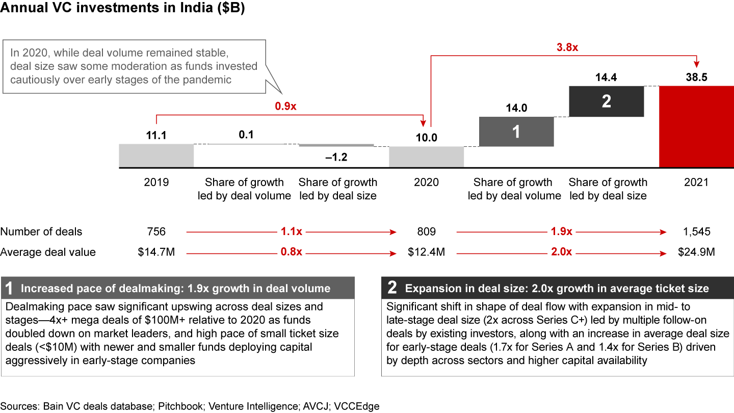 - VC investments in India had a banner year in 2021, with a meteoric 3.8x growth over 2020, to reach $38.5B in capital deployed. Remarkably, share of VC deal value within overall PE-VC investments reached 50%+ for the first time