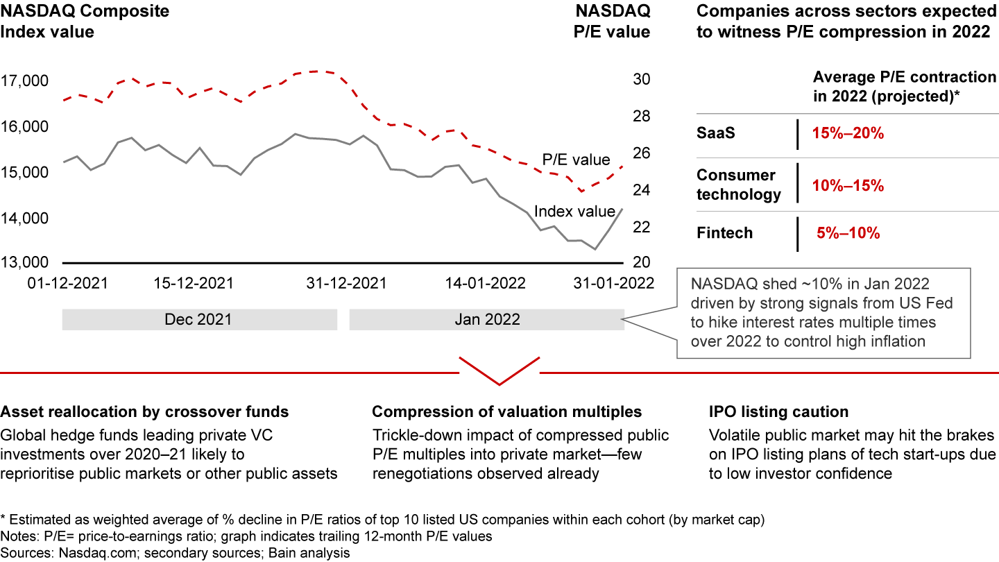 • While the first quarter of 2022 continues to see robust traction, public market trends indicate some headwinds for VC investments in 2022, augured by a spate of multiples compressions in publicly listed tech companies on global exchanges. We expect continued funding momentum given dry powder availability and depth in the ecosystem; however, a few shifts in the pace and quality of deals are likely. Focus will probably shift to larger rounds in quality assets as dealmaking returns to a more measured pace. A few new sectors will probably see emergent growth (crypto- and blockchain-based technologies, healthtech, and agritech). Further, anticipated tech listings in the pipeline may have to adopt a wait-and-watch approach for the markets to rebound