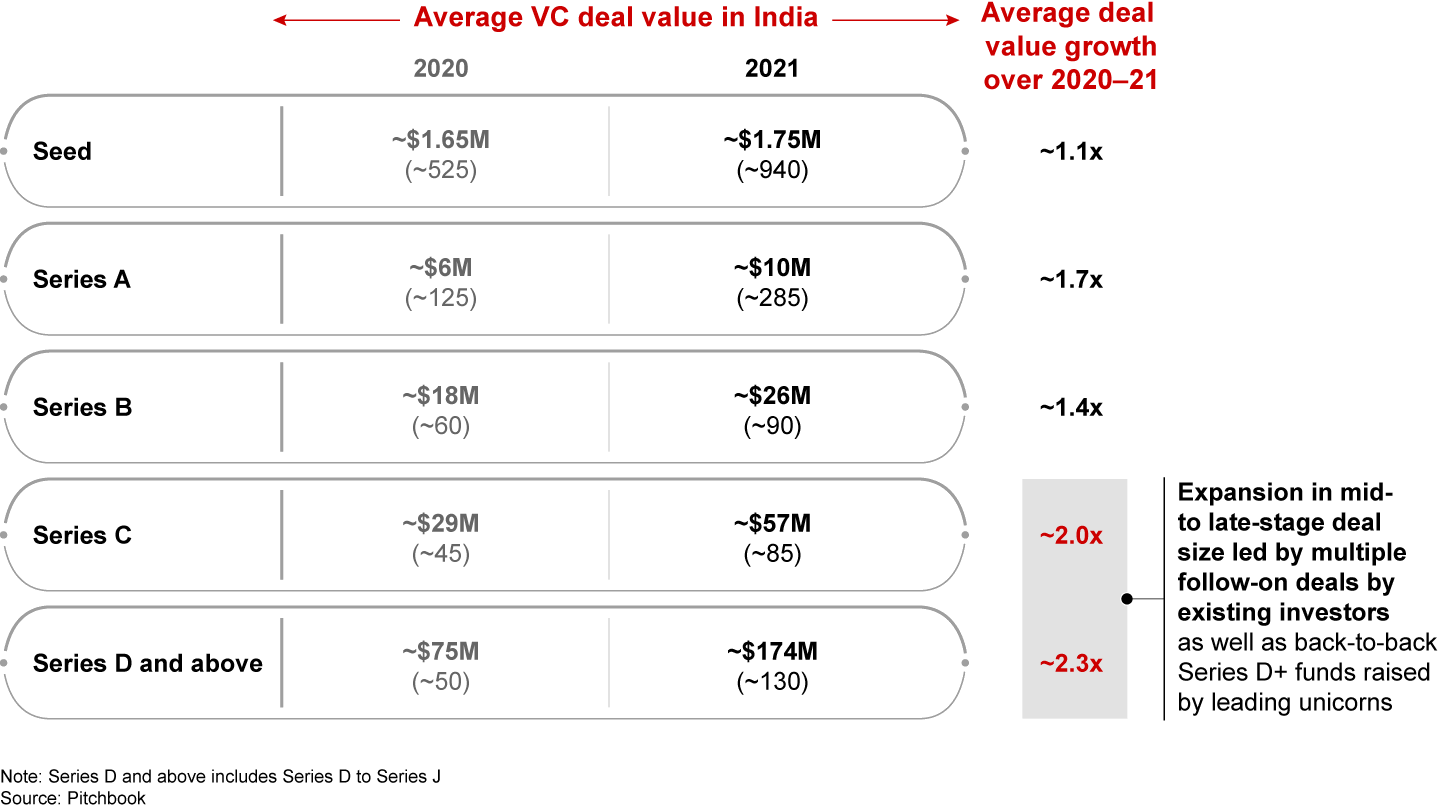 • Investment growth was led by both deal volume growth (1,545 deals vs. base of 809—1.9x growth) and average deal size growth (from $12.4M to $24.9M) over 2020–21. 2021 also saw a record upswing in mega rounds of $100M+ occurring as global VCs led 92 large ticket size rounds (mostly follow-on growth equity investments), 7 of which were $500M+ rounds in major capital commitments in market leaders such as Swiggy (online food delivery), Dream11 (gaming), and Eruditus (edtech)