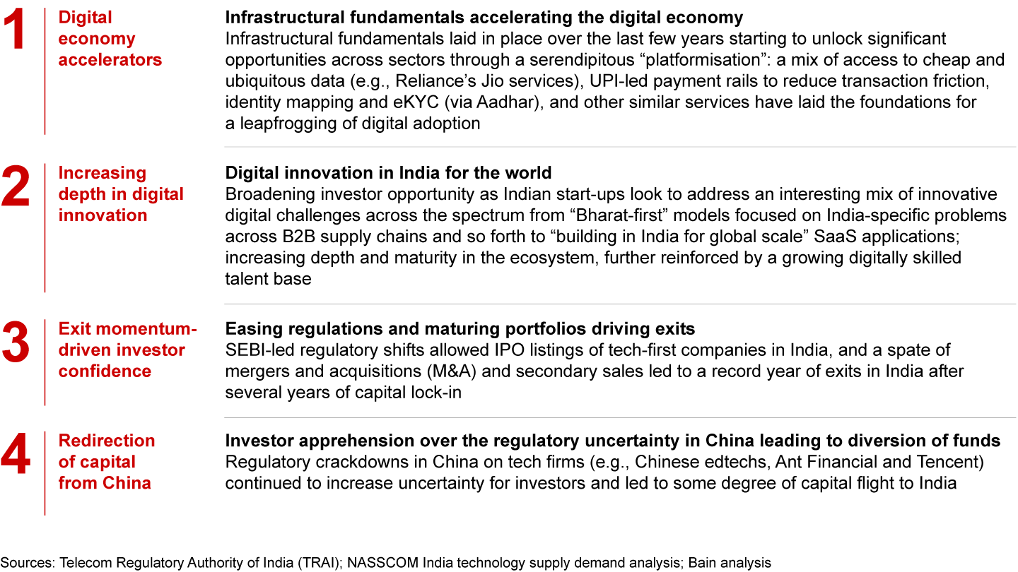 • Investing momentum in India was driven by a pivotal convergence of tailwinds. Digital infrastructural fundamentals (e.g., cheap data access, UPI, eKYC via Aadhar) opened enormous economic opportunities that are increasingly being addressed by the deepening start-up ecosystem in India. Investor confidence was also reinvigorated by a record year of exits, especially as public listings gained momentum. Regulatory crackdowns in China on tech firms created further uncertainty, driving some degree of capital flight to India