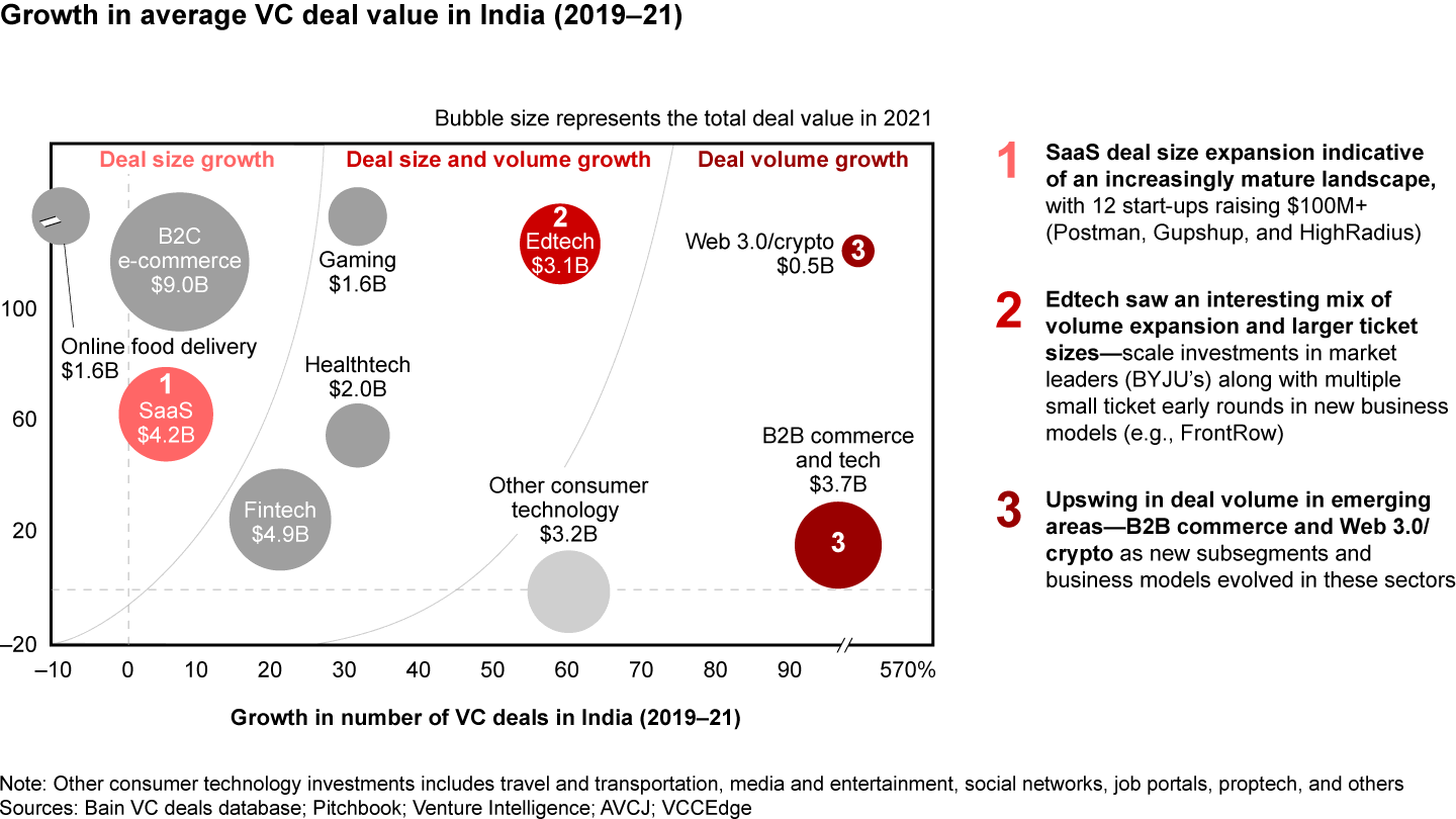 • A couple of watchouts may continue to affect the ecosystem for a while: stricter IPO norms are expected from SEBI, regulatory uncertainty for a few sectors is likely to continue (e.g., online gaming and fintech), and a competitive talent market will continue to strain the ecosystem