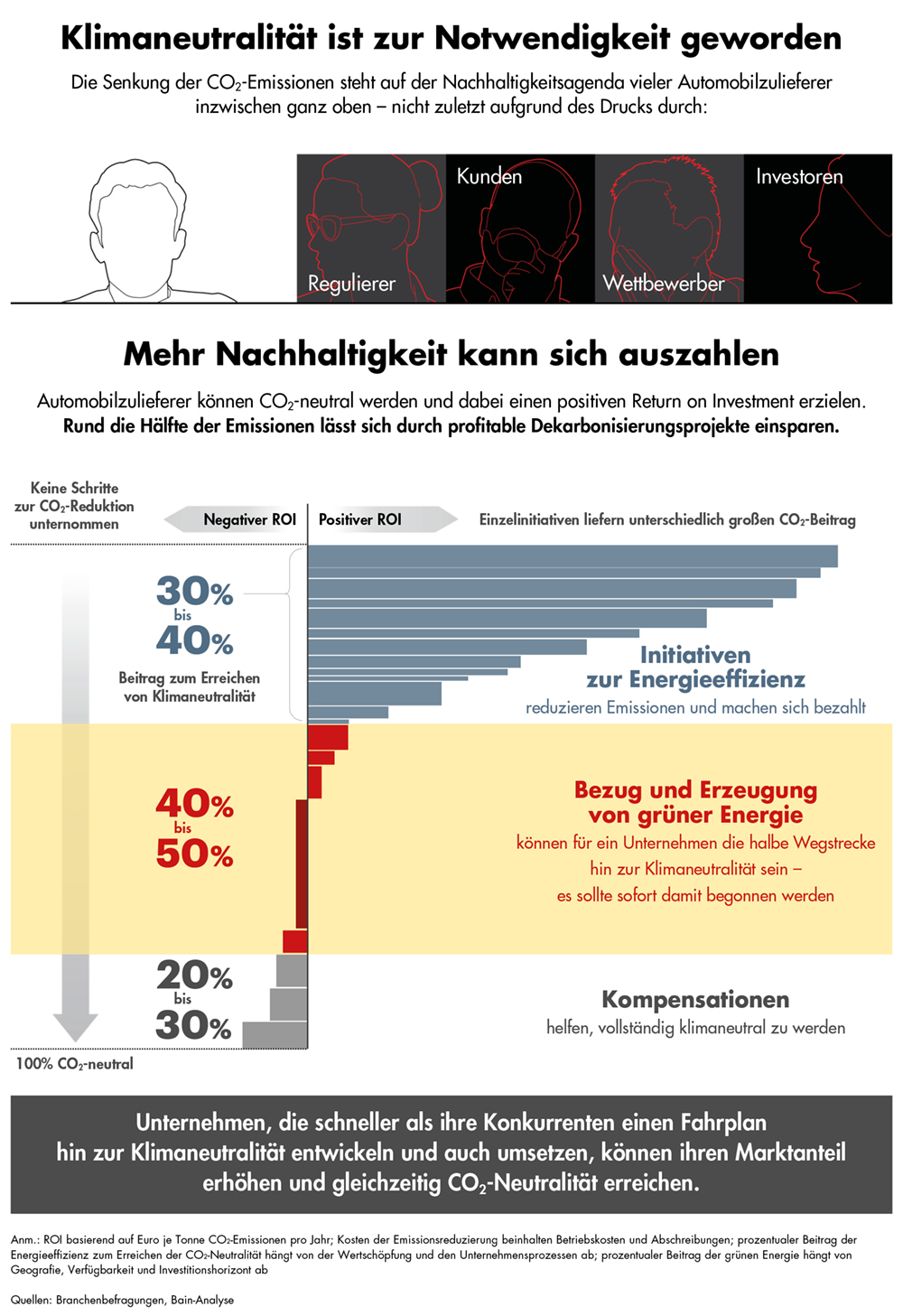 Viele Automobilzulieferer setzen inzwischen vermehrt auf Nachhaltigkeit und auf die Senkung ihrer CO2-Emissionen. Denn die Dekarbonisierung ist inzwischen zur Notwendigkeit geworden. Die Fahrzeughersteller fordern zunehmend Klimaneutralität in der Erzeugung der Komponenten. Auch Wettbewerber, Investoren und Regulierer erhöhen den Druck. Die Umstellung auf grüne Energie bei Bezug und Erzeugung ist daher alternativlos und kann die halbe Wegstrecke hin zur Klimaneutralität sein. Entsprechend frühzeitig sollte sie erfolgen. Weitere 30 bis 40 Prozent der CO2-Reduktion lassen sich durch Initiativen zur Energieeffizienz erreichen. Dies können Prozesseffizienz, ein moderner Maschinenpark und Energierückgewinnung sein. Durch einen positiven Return on Investment zahlen sich diese Maßnahmen auch finanziell aus. Kompensationen können helfen, den finalen Schritt hin zur Klimaneutralität zu machen. Unternehmen, die sich mit der Dekarbonisierung beizeiten befassen und sie zügig angehen, vermeiden zusätzliche Kosten, bauen Marktanteile aus oder gewinnen diese zurück.
