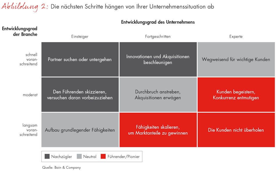 Bain hat in einer Studie rund 300 Unternehmen analysiert und herausgefunden, dass sich diese zwar durchgängig der bevorstehenden Umwälzungen bewusst sind, fast 80 Prozent aber bei der Anpassung ihres Geschäftsmodells noch am Anfang stehen. Jede Branche wird zu einem gewissen Grad eine „digicale“ Revolution durchlaufen. Wenn Unternehmen das realisieren und ihr Geschäftsmodell weiterentwickeln, müssen sie den Wettbewerb der Zukunft nicht scheuen. Es gilt jetzt zu handeln und eine umfassende Transformation anzugehen (siehe Abbildung 2).