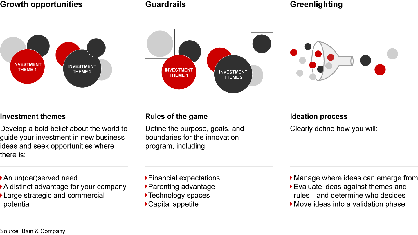 Innovation can be seductive, but companies can’t let sexy ideas or pet projects distract from the ultimate goal: growing a business to scale. That starts by finding the right opportunities for growth: Does a potential offering solve a real market need (that we have a distinct ability to deliver)? Could it grow large enough to change the trajectory of our business, and, if so, how long will that take? Innovation ROI also requires rules: clear financial expectations (and appetite) for individual projects and overall portfolios. And it means carefully managing where innovation ideas come from, how they’re evaluated, and who decides whether they meet the criteria for investment (see Figure 2).