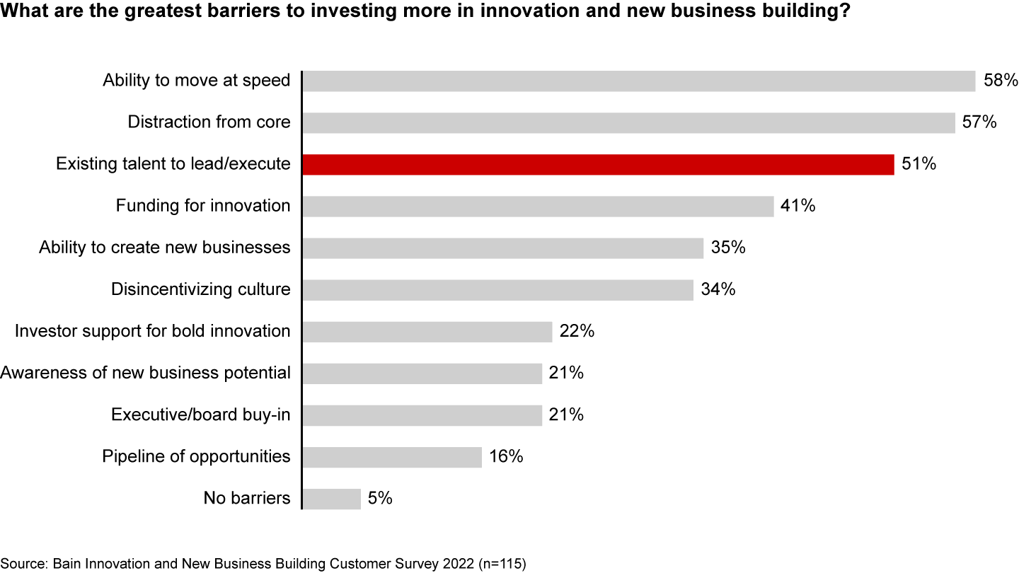 Once start-up companies and their venture capital backers gain traction in the market, they shift gears, hiring a CEO who can broaden the start-up’s focus from pure development to the equally challenging work of getting the business to scale. Corporate innovation needs that same type of leadership. Yet more than 50% of executives say a lack of leadership talent is one of the three top barriers to innovation, below only the need for speed and distractions from their core business (see Figure 3).
